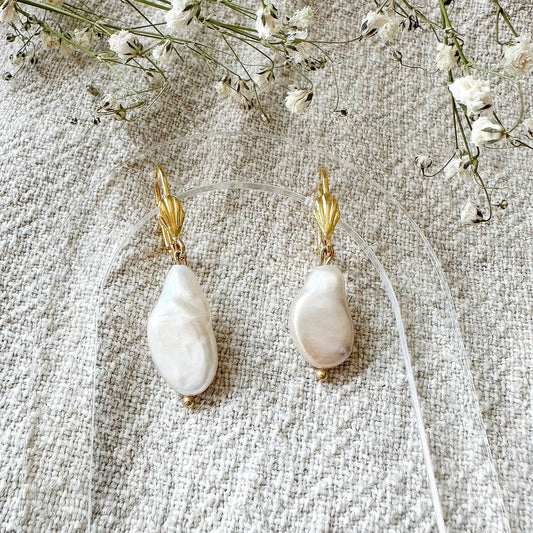 Echte Süßwasserperlen-Ohrringe "Dorisa" längliche Perle und Muschelfassung