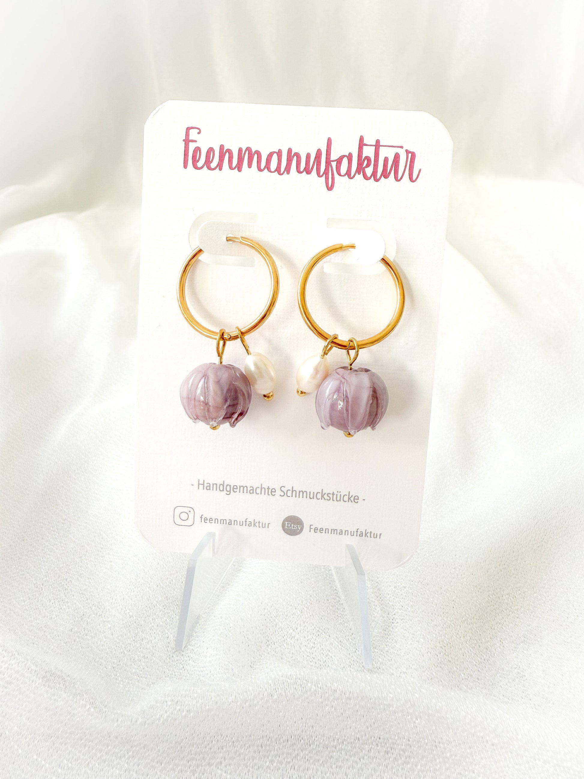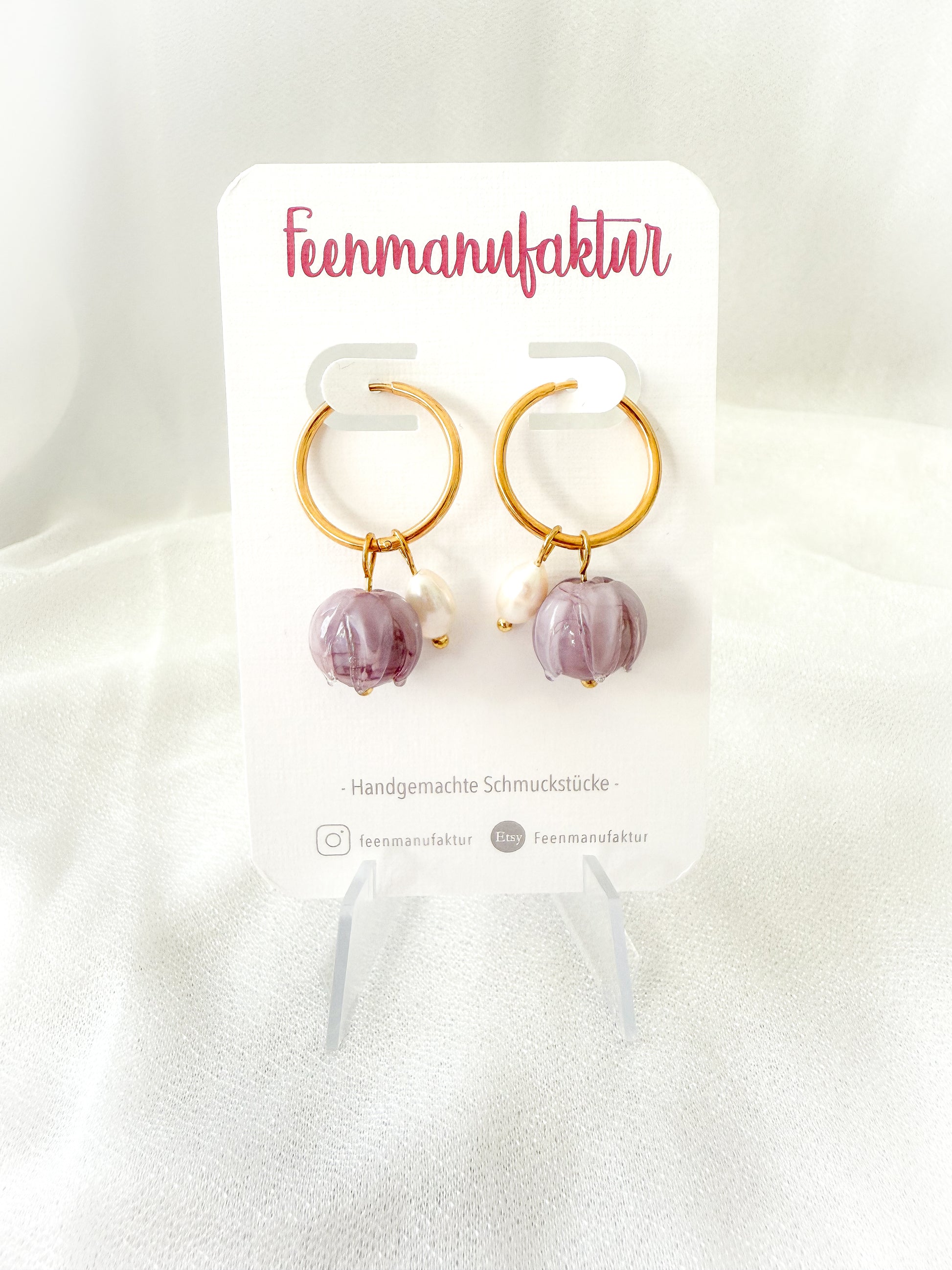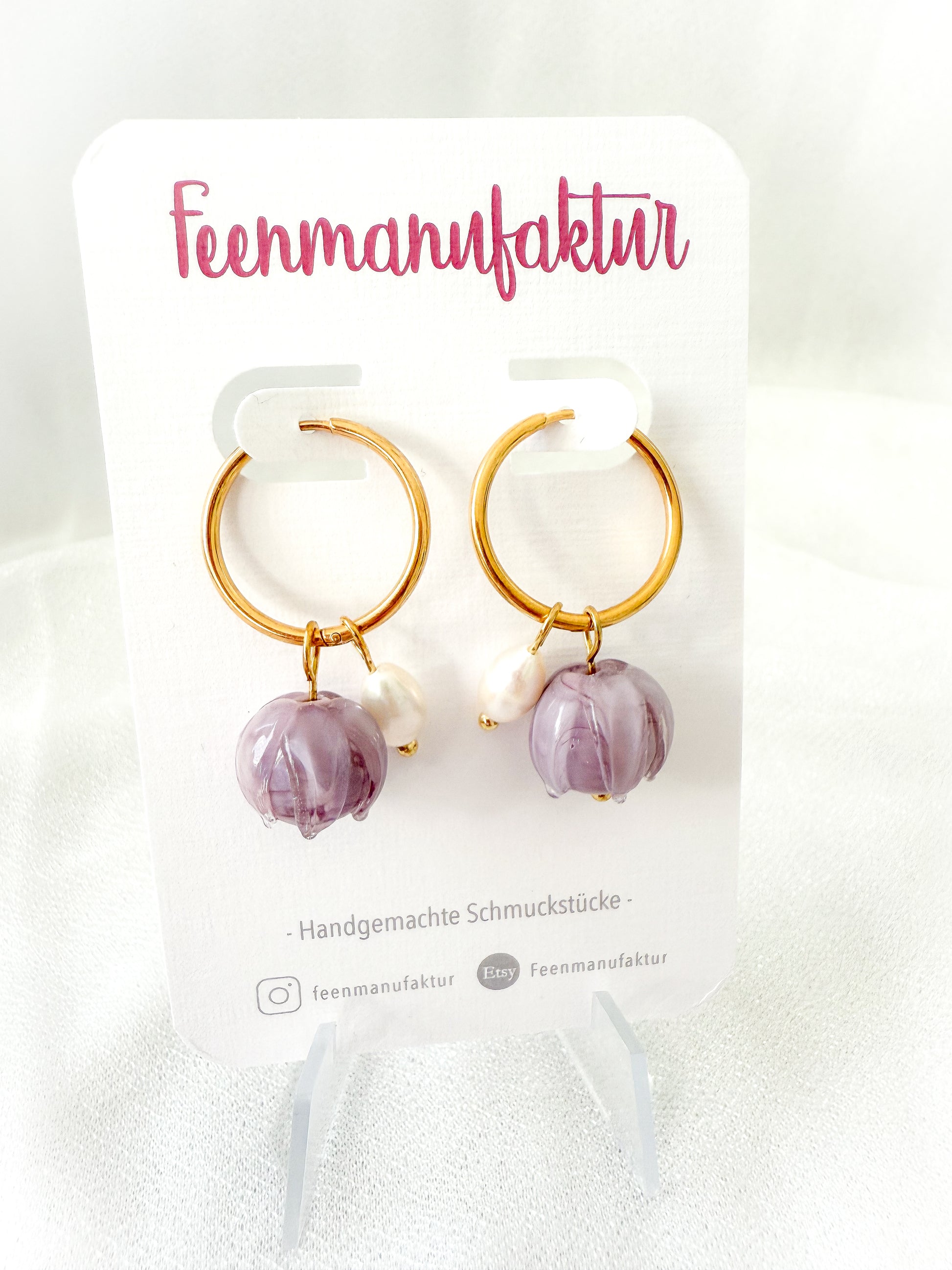 - Material: Lila Knospe, echte Süßwasserperle, goldene Creolen