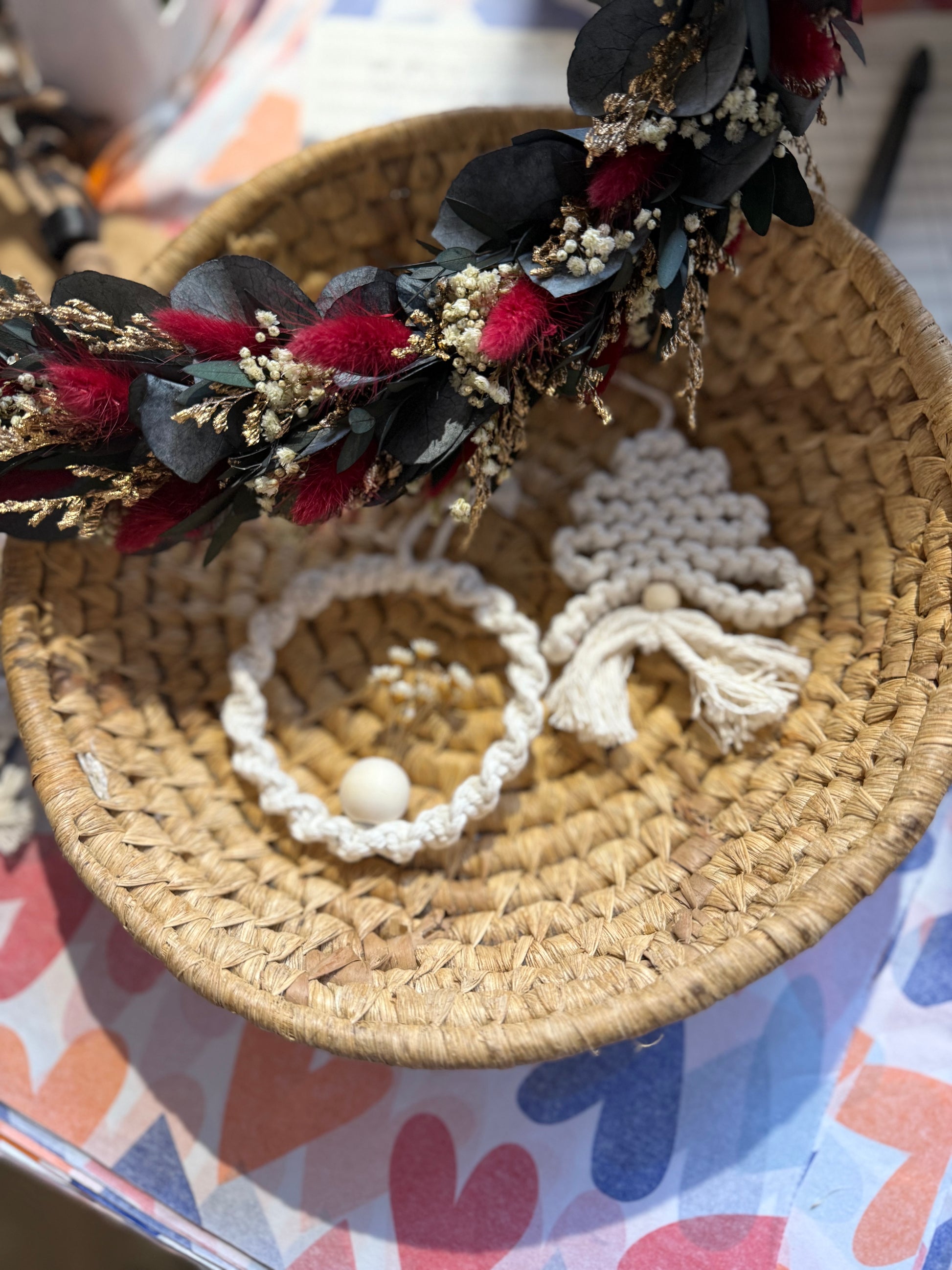 Der zarte Makramee-Ring kombiniert natürliche Materialien wie Baumwollgarn, Holzperle und feine Trockenblumen. Ideal für: