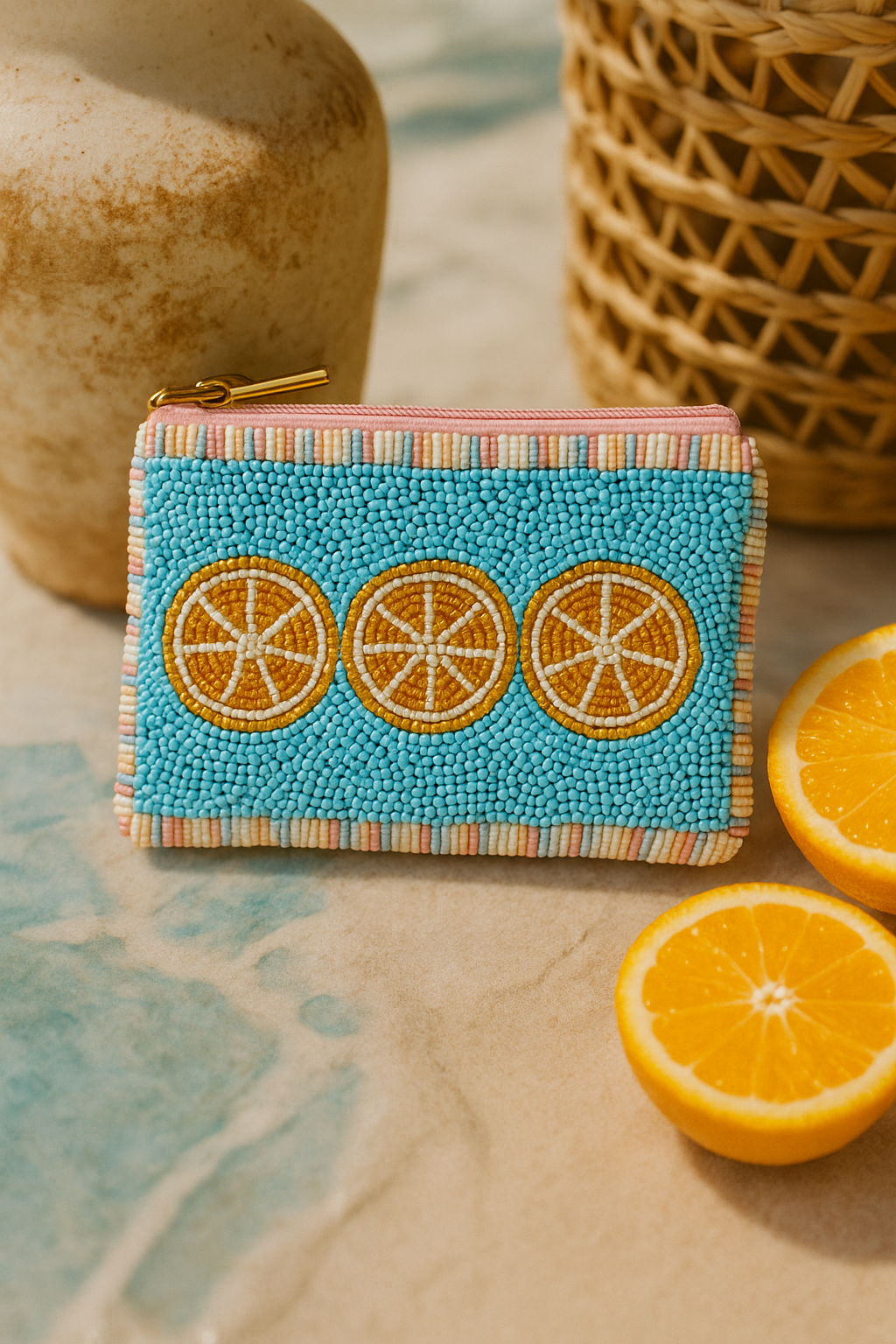 Mini-Clutch Nia – bestickte Perlen-Tasche mit Orangenscheiben